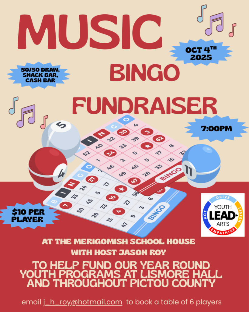 It’s October and great things are brewing at youthLEADarts Nova Scotia! youthLEADarts is excited to partner with the Merigomish Area Recreation and Social Association for a Music Bingo Fundraiser with host Jason Roy on Saturday, October 4th!