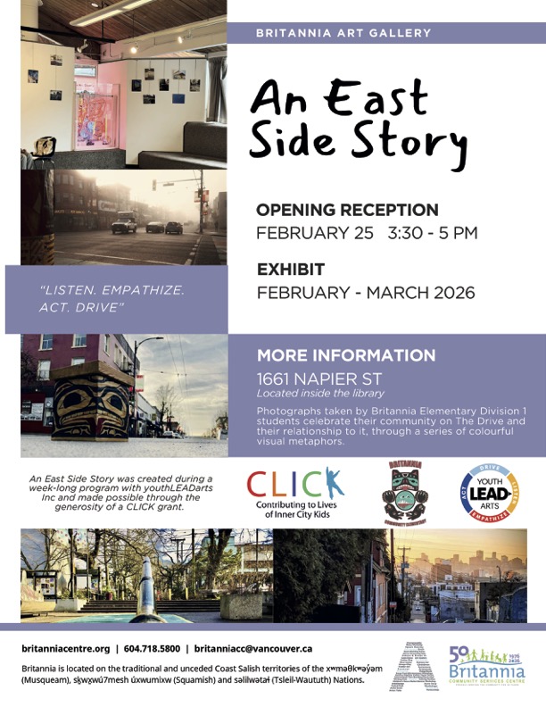 Save the date! Join us for this dynamic exhibit opening and reception on Wednesday, February 25th at Britannia Library in Vancouver. “An East Side Story” was created during a week-long program with youthLEADarts in January, and made possible through the generosity of a CLICK grant.